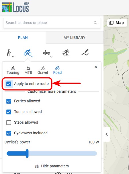 Sie können Ihre eigenen Einstellungen auf einzelne Abschnitte der Route oder auf die gesamte Route gleichzeitig anwenden. Aktivieren Sie dazu einfach die entsprechende Option: