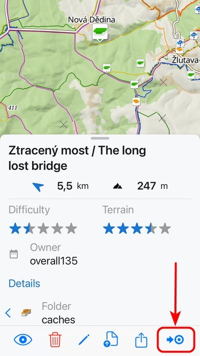 Die Anleitung zeigt eine gerade Linie von Ihrem Standort zum angegebenen Zielort an. Sie eignet sich daher ideal für die Anleitung in offenem Gelände, beispielsweise zu einem Cache. Natürlich können Sie auch zu Sehenswürdigkeiten auf der Karte (sogenannten LoPoints) oder zu Ihren eigenen Punkten navigieren.