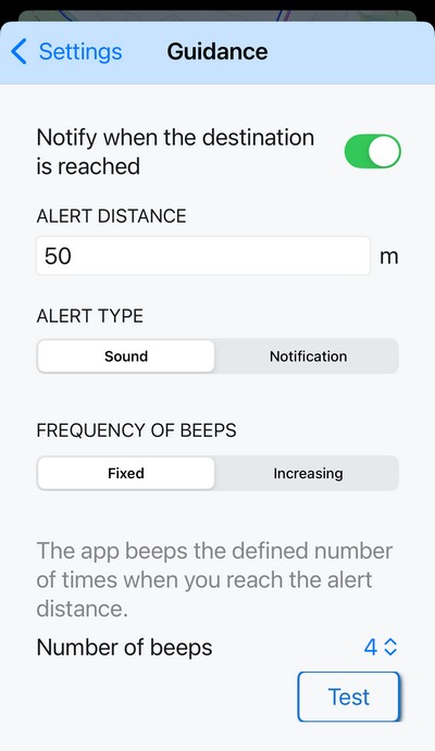 Es umfasst auch ein Benachrichtigungssystem, das Sie warnt, wenn Sie sich in einer bestimmten Entfernung von Ihrem Ziel befinden – Sie können zwischen einem Signalton oder einer Systembenachrichtigung wählen. Diese Entfernung können Sie natürlich individuell anpassen. Cacher werden auch den Signalton mit zunehmender Frequenz zu schätzen wissen – der Signalton wird schneller, je näher Sie dem Ziel kommen (oder langsamer, je weiter Sie sich davon entfernen):