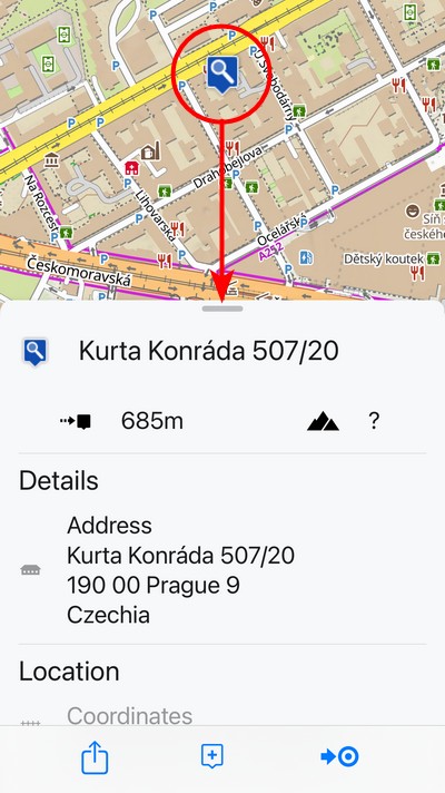 Wenn Sie Ihren Finger auf eine beliebige Stelle auf der Karte halten, wird ein temporärer Punkt mit Koordinaten, Luftlinie und Postanschrift erstellt: