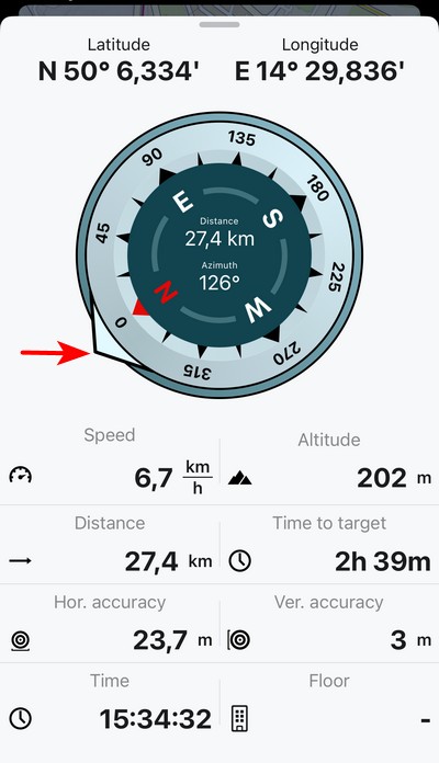 Wenn die Zielführung aktiviert ist, zeigt der Kompass einen Pfeil an, der in Richtung des Ziels zeigt: