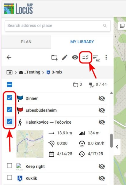 Aktivieren Sie zunächst den Mehrfachauswahlmodus. Markieren Sie dann die Routen und Punkte, für die Sie weitere Aktionen durchführen möchten: