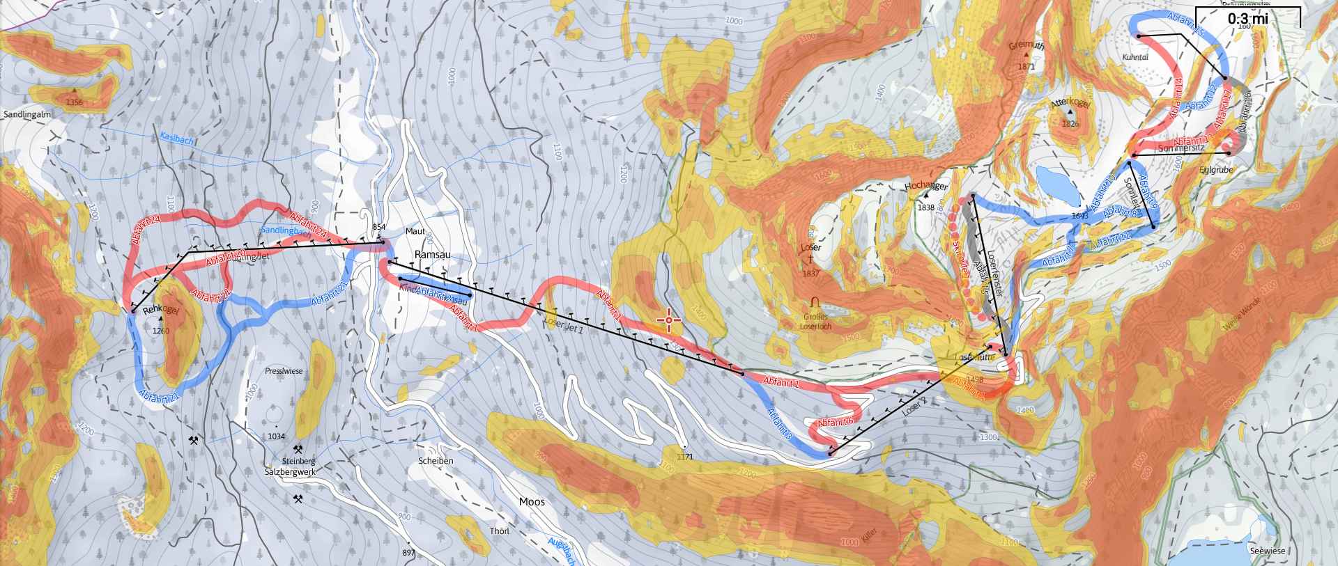 Maps are available in Summer and Winter versions, covering Austria, Germany and Northern Italy. Summer maps display a rich set of topographic features with detailed contour lines, rock drawings, hiking tracks and bike routes. Winter maps are optimized in color and feature ski runs, ski lifts, cross-country skiing tracks and slope gradients.